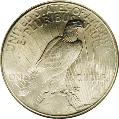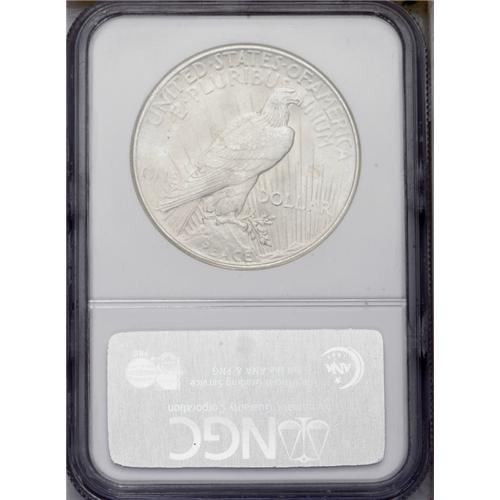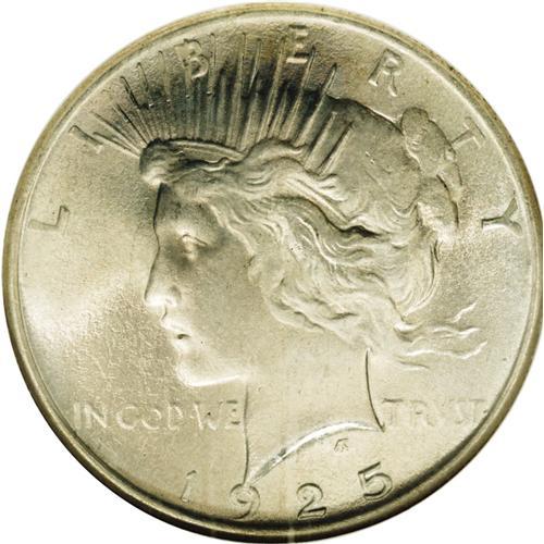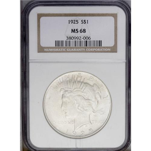 <B>1925<img border='0' src='http://www.heritagecoins.com/images/star.gif' width=10 height=10>$1> MS68 NGC.</B></I>The Peace dollar design was produced from 1921 through 1935 with a total production in excess of 190,000,000 coins, including just over 10,000,000 of this 1925 issue. Despite this large mintage, this is the only NGC MS68 of the design, and PCGS has certified just two, one dated 1924 and the other dated 1925. Anthony de Francisci designed this coin after receiving an invitation from the Commission of Fine Arts to participate in a design contest for a new Peace coin. His wife, Teresa [Cafarelli], served as the model for the obverse which was considered acceptable. His reverse design depicted an eagle breaking a sword, which was intended to represent disarmament or peace. This was not considered acceptable and a new reverse design was created by George Morgan. Thus, de Francisci only designed the obverse of the Peace dollar, and even this was modified after the initial production of High Relief examples, as can be seen in previous lots in this sale. The entire Peace coin concept was initially proposed by Farran Zerbe, the same man who promoted many gold commemorative issues previously. Zerbe was politically influential, both at the Mint and in Congress, and was fortunate to see many of his coinage concepts come to fruition. At the 1920 ANA Convention, Zerbe presented a paper discussing a commemorative coin to honor peace after World War I. The text of his paper is printed in the October 1920 issue of <I>The Numismatist.</B></I><BR> There are no unusual varieties of the 1925 Peace dollar issue. In fact, the most recent edition of the Van Allen-Mallis reference, the standard variety guide to Morgan and Peace dollars, does not listed any unusual or remarkable varieties. This example is an amazing Superb Gem, the only one of its kind certified by NGC. The surfaces are graced by wispy orange and gold toning and exhibit a satiny or pebbly texture. Only a couple minor luster grazes keep this example from perfection. All of the design features are fully defined, and are as sharp as can be for this Peace dollar design. This is an extraordinary 1925 Peace dollar.<BR><I>From The Robert Moreno Registry Collection of Peace Dollars.</B></I>