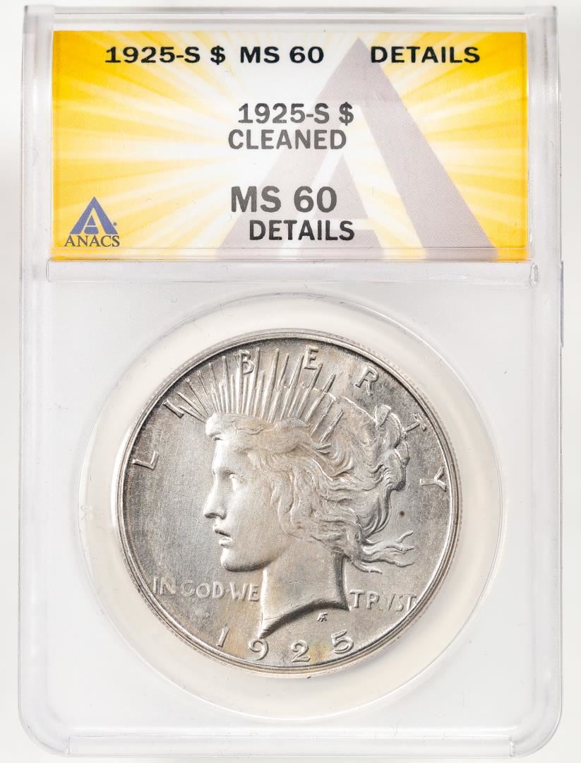 One 1925-S $1 Peace Silver Dollar Coin ANACS MS60 Details Cleaned. ANACS Certified.