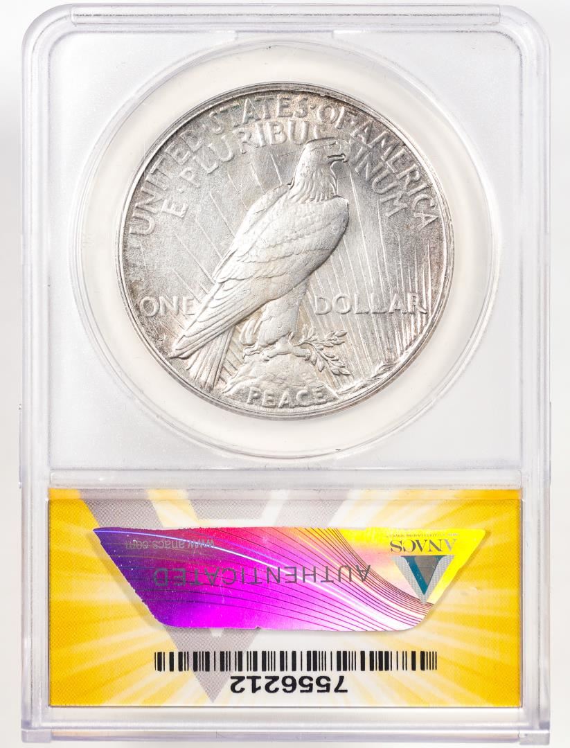One 1925-S $1 Peace Silver Dollar Coin ANACS MS60 Details Cleaned. ANACS Certified.