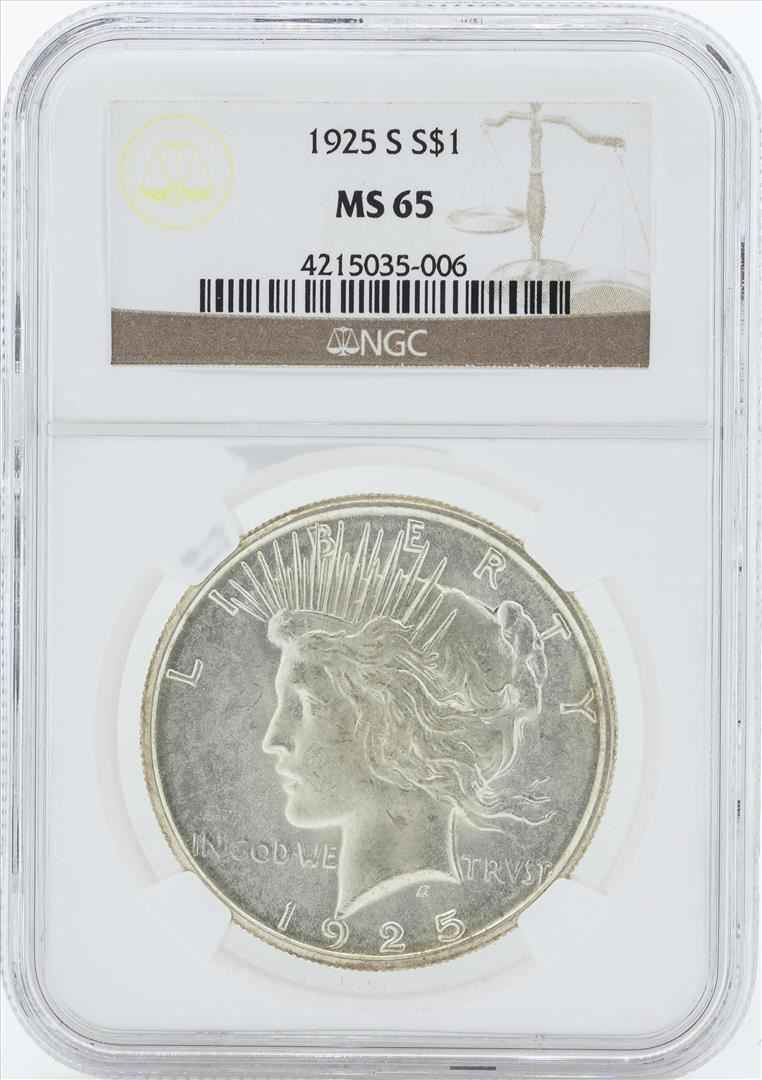 One 1925-S $1 Peace Silver Dollar Coin NGC MS65. The 1925-S Peace Dollar is the second rarest, only trailing the 1928-S Peace Dollar, in the at or above Gem Mint State Grade level. The offered piece is an outstanding example of a well struck coin and is sure to bring strong bids at auction. NGC Certified.