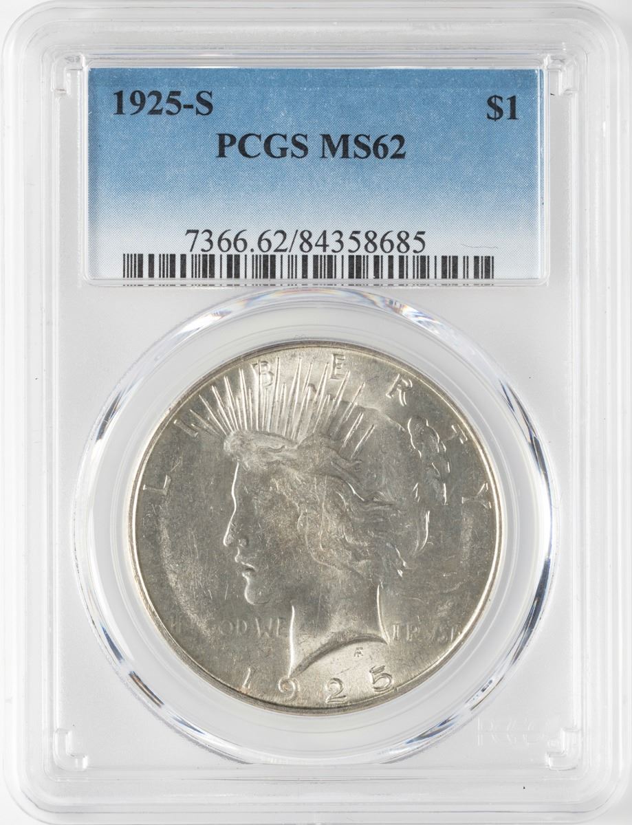 One 1925-S $1 Peace Silver Dollar Coin PCGS MS62.