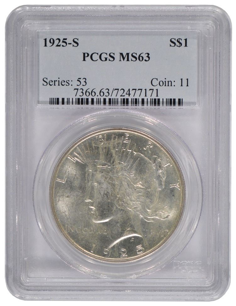One 1925-S $1 Peace Silver Dollar Coin PCGS MS63.