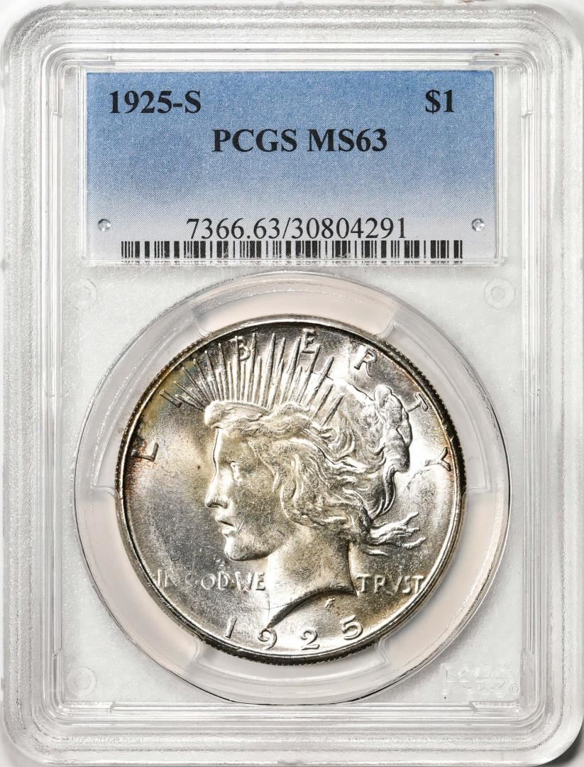 One 1925-S $1 Peace Silver Dollar Coin PCGS MS63. PCGS Graded.