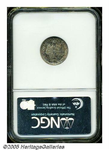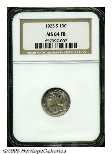 <B>1925-S<10C> MS64 Full Bands NGC.</B></I> Very scarce with full band definition, the lustrous surfaces are covered with mottled reddish-violet and blue toning. At the MS64 level, this piece represents excellent value and is available at a fraction of the price of a full Gem coin.