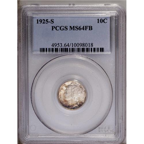 <B>1925-S<10C> MS64 Full Bands PCGS.</B></I> Extremely choice for the grade, displaying some mottled sunset-red, antique-golden, and gunmetal-blue toning on the obverse. The '25-S Mercury is not only a scarce issue in higher grades, but its reputation for being poorly struck makes Full Bands specimens all the more desirable.