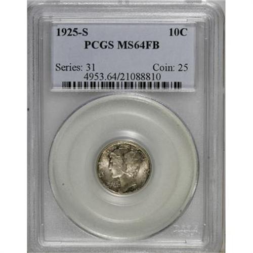 <B>1925-S 10C MS64 Full Bands PCGS.</B></I> Both sides show mottled amber-gray and charcoal patina, somewhat deeper on the reverse. Considerable luster percolates through the moderate coloration, however, and a single hair-thin scrape on Liberty's cheek is the only singular contact. One of a string of mid-1920s difficult S-mints to find in high Mint State with Full Bands designation.<BR><BR><B>Coin Engraver:</B> Adolph A. Weinman<BR><BR><b>Shipping:</b> Coins & Currency (<a target="_blank" href="http://www.heritageauctions.com/common/shipping.php">view shipping information</a>)