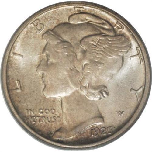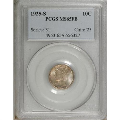 <B>1925-S 10C MS65 Full Bands PCGS.</B></I> The 1925-S (5.8 million pieces produced) is not a challenging coin to locate in most grades. This date, however, is probably the most poorly struck in the entire Mercury Dime series, and even those coins that display Full Bands definition are apt to posses indistinct peripheral detail and/or numerous die polishing lines. That said, we are pleased to be offering the present Gem. Both the peripheries and the central devices are impressive for their sharpness of strike, and the frosty textured surfaces are veiled in mottled champagne-apricot patina. Solidly graded at the MS65 Full Bands level. Population: 56 in 65 Full Bands, 20 finer (6/07).<BR><BR><b>Shipping:</b> Coins & Currency (<a target="_blank" href="http://www.heritageauctions.com/common/shipping.php">view shipping information</a>)