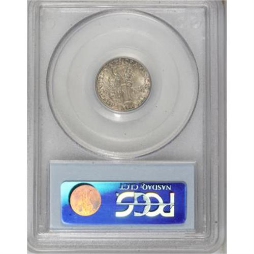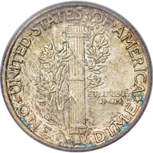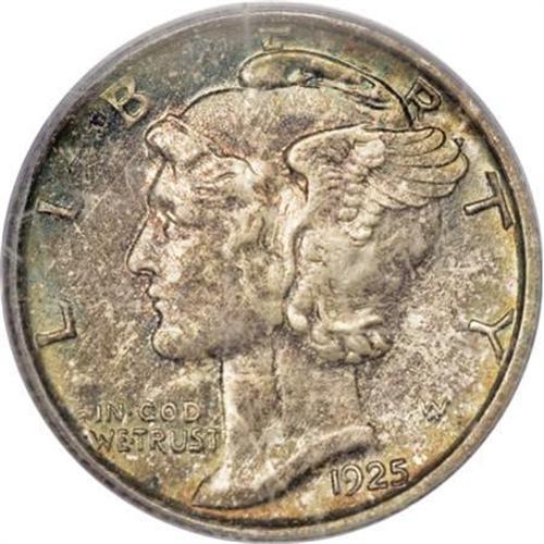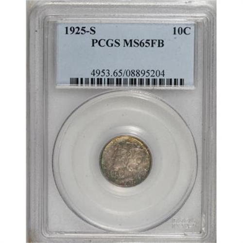 <B>1925-S 10C MS65 Full Bands PCGS.</B></I> The 1925-S is arguably the worst-produced of all issues in the Mercury dime series. However, the habitual softness of strike that plagues the issue in general is not reflected on the fully split central reverse bands of this pleasing example. Vibrant mint luster is only slightly affected by the presence of rather deep mottled toning that covers each side. A solid Gem with no mentionable abrasions. A thin, vertical depression of mint origin extends vertically through the center of Liberty's neck, without influencing the technical grade of the piece. Population: 57 in 65 Full Bands, 20 finer (10/07).<BR><BR><B>Coin Engraver:</B> Adolph A. Weinman<BR><BR><b>Shipping:</b> Coins & Currency (<a target="_blank" href="http://www.heritageauctions.com/common/shipping.php">view shipping information</a>)
