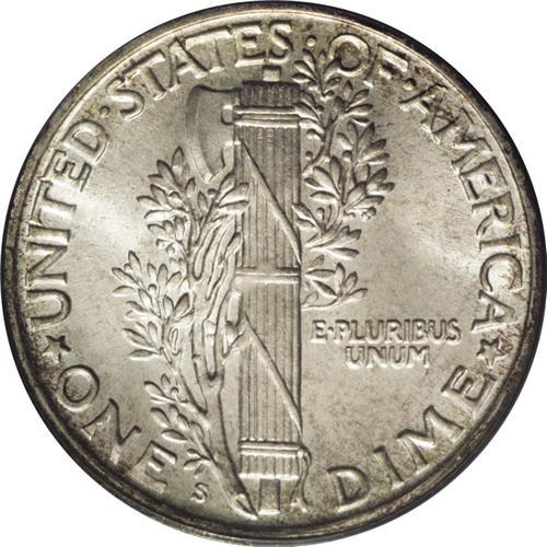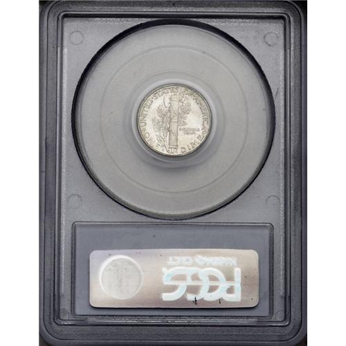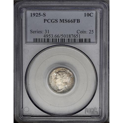 <B>1925-S<10C> MS66 Full Bands PCGS.</B></I> Some Mercury dime experts believe the 1925-S holds the record for the most poorly made date in the entire series. David Lange, for example, in his book <I>The Complete Guide to Mercury Dimes,</B></I> writes: "Both obverse and reverse [are] plagued by heavy die polishing and erosion and a generally weak strike throughout. This is especially noticeable around the reverse periphery. Some of the letters in UNITED STATES OF AMERICA may be indistinct, particularly at their tops...."<BR> The Premium Gem offered here is, in most cases, a notable exception. The central devices are quite sharp; only a couple of greenery stems to the right of the fasces display evidence of overzealous die lapping. Most of the peripheral lettering is likewise well executed, with only three or four of the letter tops revealing minor softness. Highly lustrous surfaces show dappled olive-green and lavender toning, which is much more prominent on the obverse. A small linear mark beneath the reverse motto is the only flaw (and an inconsequential one at that) on this marvelous coin. Population: 17 in 66 Full Bands, 4 finer (3/06).