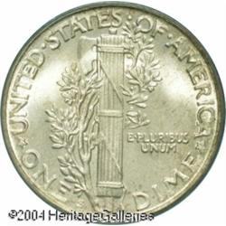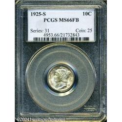 1925-S 10C MS66 Full Bands PCGS. This issue is sca <B>1925-S 10C MS66 Full Bands PCGS.</B></I> This issue is scarce in any grade of Uncirculated, but high grade pieces are rare. More than 5.8 million 1925-S Dimes were struck, but the vast majority entered circulation. Of those that were set aside, poor striking quality restricts most from receiving grades of MS64 or better. The centers of this piece show especially strong definition, the only area of weakness being around the rims, as usually seen. The obverse exhibits mottled gray, crimson, and golden-russet hues, the reverse is mostly untoned. There are no distracting marks, just a tiny abrasion northeast of the 5 in the right obverse field. An exciting, vibrant representative, exquisitely preserved and conditionally scarce. Population: 19 in 66, 4 finer (10/04). <BR><BR><B>Important notice:</B> Heritage usually auctions material at the rate of 200-250 lots per hour. On some occasions eBay Live bid software or the Internet may not be able to keep up with the pace of the auction. We recommend placing a realistic absentee bid now as insurance to avoid disappointment. Occasionally the auctioneer may eliminate or reject an eBay Live bid, and the auctioneer may also reopen a lot after the close of the eBay live bidding (usually because we missed an audience bid), and may reject your bid even if it shows you as the winning bidder. By bidding via eBay Live, you agree that Heritage may award the lot to another bidder at its sole discretion under the circumstances described above or any other reasonable circumstances. Since eBay bids are not shown to us until we open the lot on the floor, we treat those bids just like floor bids. In most cases the floor responds before the eBay bid is presented to us, due to Internet lag time, so for consistency we have made it a policy that floor bids are always considered first over tie eBay live bids. Also please note that all Heritage lots purchased through eBay Live carry a 20% Buyer's Premium. Please make sure you read the Terms and Conditions before you bid. This lot is being auctioned in conjunction with a live floor auction by Heritage Galleries & Auctioneers. All final auction and invoice information will be supplied by Heritage Galleries & Auctioneers, and all other information should be considered preliminary. Lot:5809