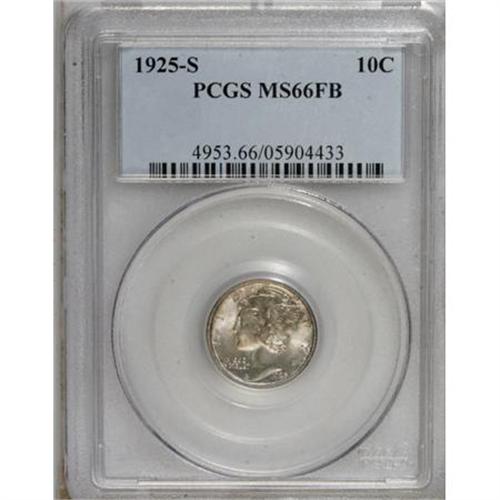 <B>1925-S 10C MS66 Full Bands PCGS.</B></I> This is a conditionally rare issue, and one that David Lange refers to as perhaps the worst-produced date in the entire Mercury dime series. The current example is a remarkable Premium Gem that displays little of the usual striking weakness that is typical for the 1925-S. The central reverse bands are fully defined, as are the often-weak obverse details. Dappled coloration over each side includes shades of sky-blue, gold, and russet. The surfaces are impeccably preserved and blemish-free. Population: 16 in 66 Full Bands, 4 finer (8/07). <BR><BR><B>Coin Engraver:</B> Adolph A. Weinman<BR><BR><b>Shipping:</b> Coins & Currency (<a target="_blank" href="http://www.heritageauctions.com/common/shipping.php">view shipping information</a>)