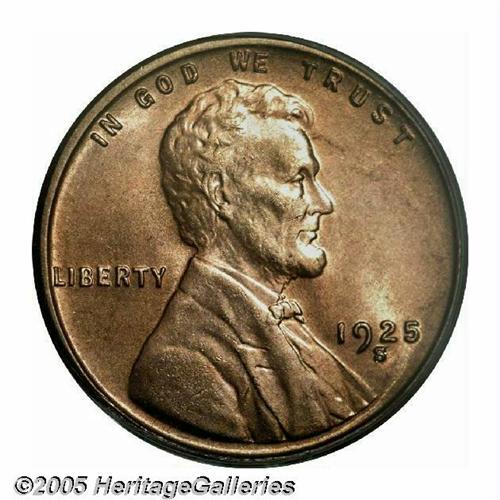 <B>1925-S<1C> MS65 Red PCGS.</B></I> An often poorly produced S-mint issue of more than 26 million coins that, combined with an extremely low survival ratio in Mint State, has emerged as one of the most challenging Lincoln Cents in Gem condition. As is normally found on the occasional high grade representative, this elusive Gem example displays characteristic rich reddish-orange color. The strike is far superior to the typical Uncirculated survivor, being almost fully defined on the highpoints of the portrait and displaying strong peripheral lettering. Even the wheat stalks are razor sharp. A paper-thin blemish on Lincoln's cheek and another just above the 1 of the date are mentioned as pedigree markers. Seldom offered in this near-ultimate grade and a coin that is certain to be eagerly sought by collectors assembling high grade sets. Population: 10 in 65, 0 finer (3/05).<BR><I>From The Tom Mershon #2 All-Time PCGS Registry Set of Lincoln Wheat Cents.</B></I>