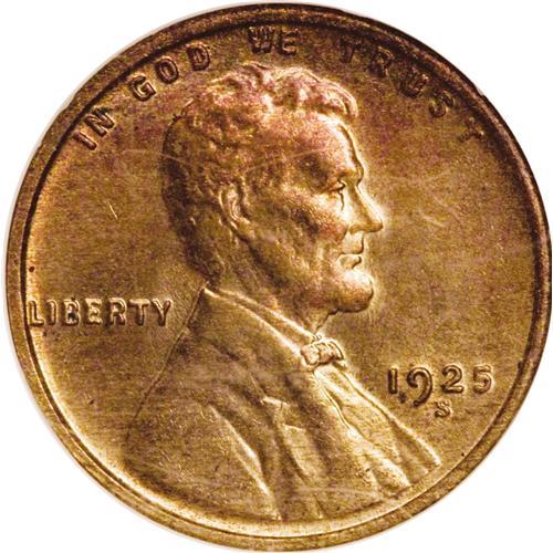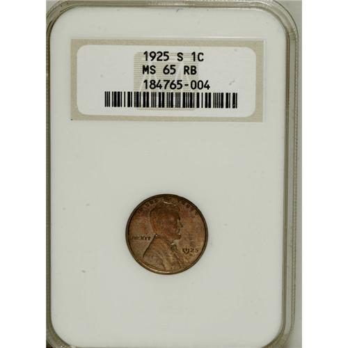 <B>1925-S 1C MS65 Red and Brown NGC.</B></I> Mint State examples of the 1925-S are not difficult to acquire. However, Gem examples with full red or even Red and Brown color are very rare as one can see from examining the population data from the two major services. A total of 16 pieces have been certified as MS65 Red and Brown by NGC and PCGS together and none are finer (4/07). This is a bright, lustrous example that displays orange-red color with an occasional streak of pale blue that accounts for the brown part of the Red and Brown designation. Sure to be of interest to many advanced Lincoln cent collectors as this coin has very little non-red on either side.<BR><BR><b>Shipping:</b> Coins & Currency (<a target="_blank" href="http://www.heritageauctions.com/common/shipping.php">view shipping information</a>)