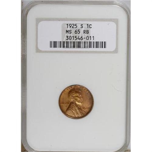 <B>1925-S 1C MS65 Red and Brown NGC.</B></I> This unabraded Gem is well struck aside from minor incompleteness on the O in ONE. Lemon, olive, and peach consume the obverse, while the reverse is mostly rose-red with peripheral yellow-gold. A few tiny ebony flecks are of little import. Certified in a prior generation holder.<BR><BR><b>Shipping:</b> Coins & Currency (<a target="_blank" href="http://www.heritageauctions.com/common/shipping.php">view shipping information</a>)