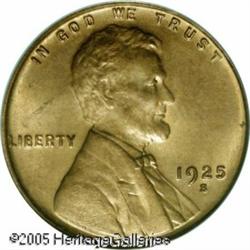 <B>1925-S 1C MS65 Red and Brown PCGS.</B></I> A charming S-mint Lincoln that possesses nearly full original orange luster, only faded just a tad and now more golden in color. The strike, however, is perhaps this Gem's greatest asset, being almost fully executed over the major design elements. Very scarce with these qualities. Population: 6 in 65, 0 finer (1/05). Lot:5492