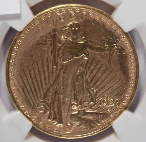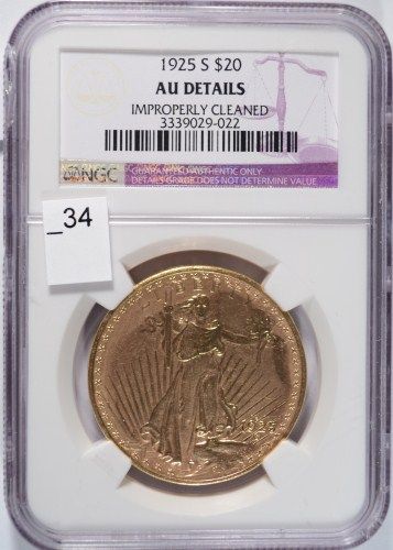 1925-S $20.00 GOLD NGC AU, MINOR CLEANING, RARE DATE!