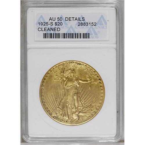 <B>1925-S<$20>--Cleaned--ANACS. AU50 Details.</B></I> Nicely struck and yellow-orange with significant darkly toned copper spots. A lightly worn and lightly hairlined piece with a washed-out look overall.