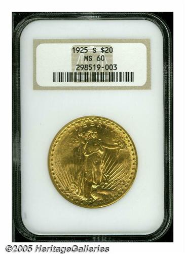 <B>1925-S<$20> MS60 NGC.</B></I> This is an important opportunity for the collector, as this issue seldom appears in the market place, despite considerable importation from European sources in the 1950s. A splendid Mint State example with lustrous light yellow-gold surfaces and excellent eye appeal.<BR><I>From The Stig Ericsson Collection.</B></I>