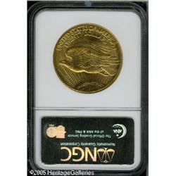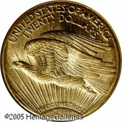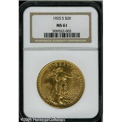 <B>1925-S $20 MS61 NGC.</B></I> A condition as well as absolute rarity in the lower grades of Uncirculated, the '25-S is considered a High R.6 in MS60-62 grades. Probably fewer than a hundred pieces are believed extant in this grade with probably 50-60 pieces finer. Bright copper-golden color is seen over the lustrous, satiny surfaces. As one would expect, there are a number of smaller abrasions in the fields. Lot:9706