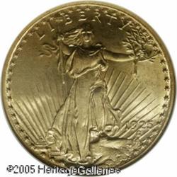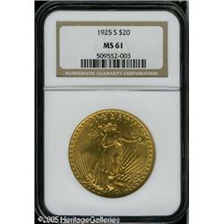 <B>1925-S $20 MS61 NGC.</B></I> The 1925-S is one of the elusive mintmarked Saint-Gaudens issues from this era that saw extensive melting in the 1930s. It does seem that a greater percentage of 1925-S Twenties entered commercial channels, as the majority of survivors are circulated to some degree, usually in the AU 50 to AU 58 grade range. Both sides are somewhat softly detailed and show a few minor cuts and marks, none of which are cause for individual concern. Lot:9707