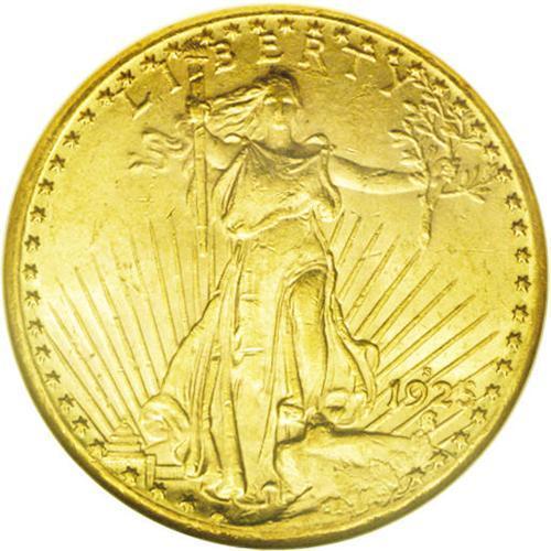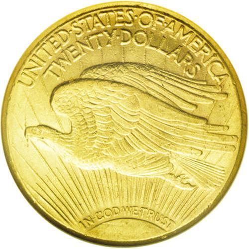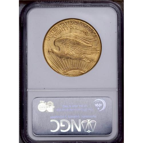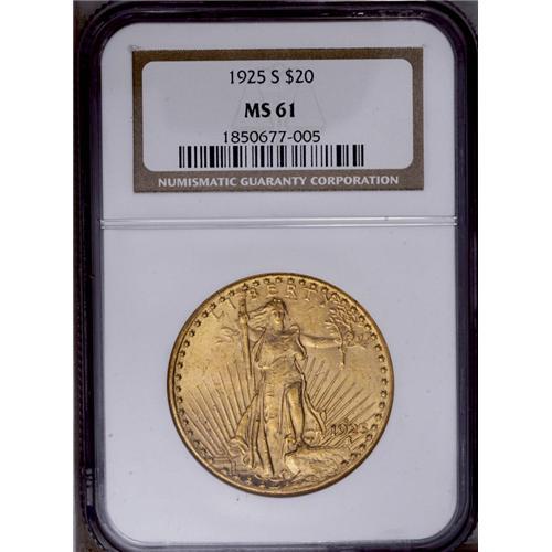 <B>1925-S<$20> MS61 NGC.</B></I> This is a pleasing example with honey-gold color and lustrous surfaces. Both sides have a number of bagmarks, serving as a grade-limiter on this piece. This is a rare and important date in the series. In Mint State grades, David Akers ranked this issue as 11th rarest out of 54 issues. A heavy vertical die crack extends through the eagle's beak.