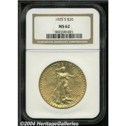 <B>1925-S<$20> MS62 NGC.</B></I> The 1925-S is one of several very scarce mintmarked double eagle issues from the 1920s. Most available examples appear to grade XF or AU. Mint State representatives, even marginal BU coins, are elusive. This is a reasonably struck coin that has bright satin-like luster overlain by apricot-gold coloration. A few abrasions consistent with the grade are scattered about, which is typical for this extensively bagmarked issue. An appealing coin for the 20th century gold specialist. Population: 96 in 62, 37 finer (5/04). <BR><BR><B>Important notice:</B> Heritage usually auctions material at the rate of 200-250 lots per hour. On some occasions eBay Live bid software or the Internet may not be able to keep up with the pace of the auction. We recommend placing a realistic absentee bid now as insurance to avoid disappointment. Occasionally the auctioneer may eliminate or reject an eBay Live bid, and the auctioneer may also reopen a lot after the close of the eBay live bidding (usually because we missed an audience bid), and may reject your bid even if it shows you as the winning bidder. By bidding via eBay Live, you agree that Heritage may award the lot to another bidder at its sole discretion under the circumstances described above or any other reasonable circumstances. Since eBay bids are not shown to us until we open the lot on the floor, we treat those bids just like floor bids. In most cases the floor responds before the eBay bid is presented to us, due to Internet lag time, so for consistency we have made it a policy that floor bids are always considered first over tie eBay live bids. Also please note that all Heritage lots purchased through eBay Live carry a 20% Buyer's Premium. Please make sure you read the Terms and Conditions before you bid. </span></font></tr></table></td></tr></table>