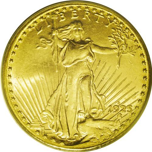 <B>1925-S<$20> MS62 PCGS.</B></I> This is an extremely important opportunity for the advanced collector to acquire an example of this date. In fact, the present sale offers collectors with a rare opportunity to choose from multiple examples. This MS62 grade coin has highly lustrous surfaces with excellent eye appeal. It is a sharply struck example without any evidence of design weakness on either side. Both sides have brilliant yellow-gold luster. The rims are sharply beveled, as always found on this issue.