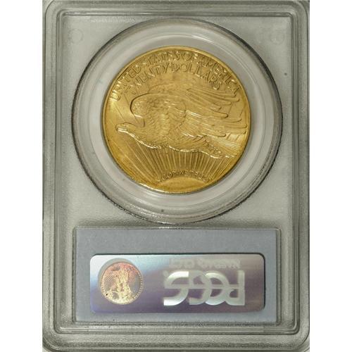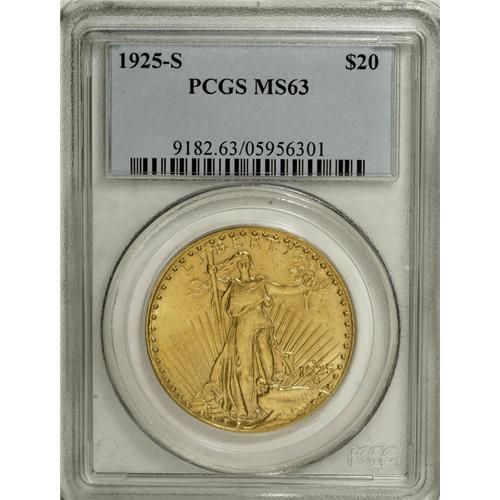 <B>1925-S $20 MS63 PCGS.</B></I> An important opportunity is presented to the advanced Set Registry collector, as this is a highly attractive piece and a rare date in the Saint-Gaudens series. This lovely piece is fully lustrous with satiny yellow-gold surfaces. In fact, some would probably call this example prooflike, as the fields on both sides are clearly reflective and lightly mirrored. Despite a substantial mintage of nearly 4 million coins, few have survived in Mint State grades and today this date is a condition rarity. Population: 72 in 63, 22 finer (3/07).<BR><BR><b>Shipping:</b> Coins & Currency (<a target="_blank" href="http://www.heritageauctions.com/common/shipping.php">view shipping information</a>)