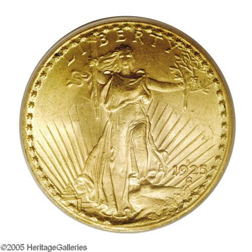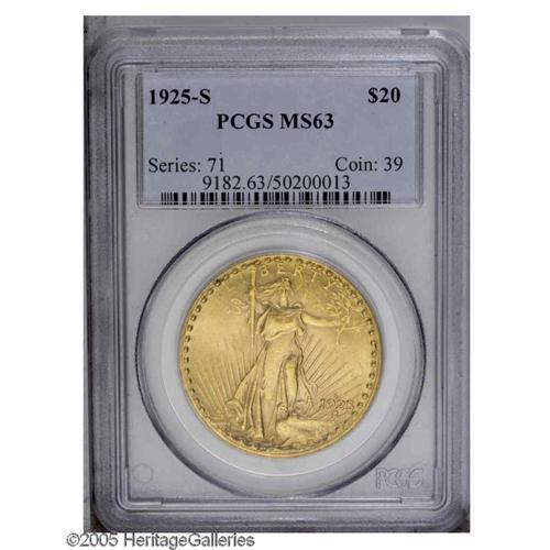 1925-S $20 MS63 PCGS. Bright, frosty yellow-gold surfa 1925-S[$20] MS63 PCGS.
