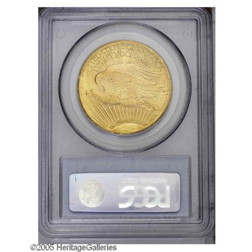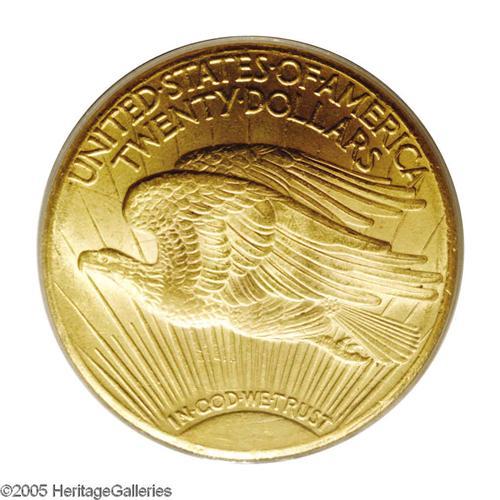 <B>1925-S<$20> MS63 PCGS.</B></I> Bright, frosty yellow-gold surfaces are typically satiny in texture and display scattered, generally light abrasions. A touch of softness is noted on Liberty's knee and the on the highpoint of the eagle's breast feathers. The heavily melted 1925-S is scarce in this grade and only rarely found finer. Population: 62 in 63, 16 finer (11/05).