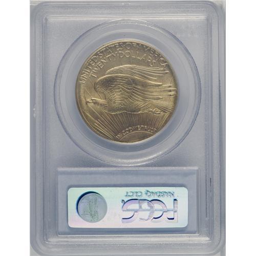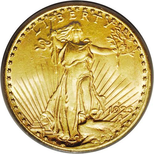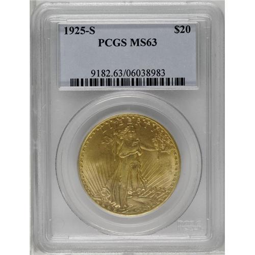 <B>1925-S<$20> MS63 PCGS.</B></I> The 1925-S is a much more challenging issue than its mintage would indicate. As a matter of fact, few people realize that there were actually over 800,000 more 1925-S double eagles produced than were minted of the much more common 1927 Philadelphia issue. This is a pleasing, lustrous example that has lovely satin-like olive and golden-orange surfaces. The often-seen reverse die cracks extend through the eagle's beak and wing feathers, but that side of the piece is free of abrasions. There are a handful of grade-defining marks on the obverse, but only one of them, in the upper left field area beneath Liberty's hair tresses, is noticeable without a loupe. The Saint-Gaudens specialist should take notice when this high-end Mint State example crosses the auction block. Population: 66 in 63, 18 finer (3/06).
