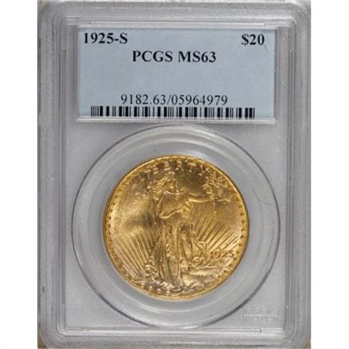<B>1925-S $20 MS63 PCGS.</B></I> Many of the rarest Saint-Gaudens double eagles have high mintages, including the '25-S. All of these rarities, usually from Denver or San Francisco, were subject to massive destruction by the government in the 1930s, after President Franklin D. Roosevelt took the country off the gold standard. In most cases, the coins were struck but never released. They remained in Mint or Treasury vaults since the time of issue, ending up in the melting pot during the mid to late 1930s.<BR> This example is one of the few coins actually released. It was either set aside by a collector in the late 1920s, or it spent several decades in Europe before its return. While each side has a few scattered surface marks that are consistent with the grade, the surfaces are fully brilliant with satiny orange-gold luster. Population: 72 in 63, 22 finer (6/07).<BR><BR><b>Shipping:</b> Coins & Currency (<a target="_blank" href="http://www.heritageauctions.com/common/shipping.php">view shipping information</a>)