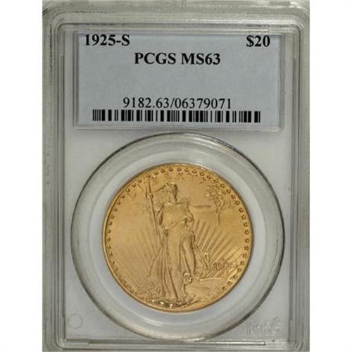 <B>1925-S $20 MS63 PCGS.</B></I> When extensive melting in the 1930s is combined with an attempt to circulate those pieces that were not set aside, the 1925-S emerges as one of the premier condition rarities in the series. The authors of the recent treatise titled <I>The Coinage of Augustus Saint-Gaudens</B></I> say: "And most important to its status as a key issue in the series, the 1925-S is one of the few dates from the 1920s that never appeared in hoard quantities in Europe."<BR> Both sides of this Select '25-S display pleasing luster exuding from apricot-gold surfaces laced with hints of light green. The design elements exhibit relatively sharp definition, though portions of the 5 in the date are weak, as is typical of the issue. A few minute marks are noted.<BR><BR><B>Coin Engraver:</B> Augustus Saint-Gaudens<BR><BR><b>Shipping:</b> Coins & Currency (<a target="_blank" href="http://www.heritageauctions.com/common/shipping.php">view shipping information</a>)
