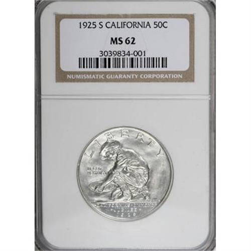 <B>1925-S 50C California MS62 NGC.</B></I> NGC Census: (170/3178). PCGS Population (447/3445). Mintage: 86,394. Numismedia Wsl. Price for NGC/PCGS coin in MS62: $174. (#9281)<BR><BR><b>Shipping:</b> Coins & Currency (<a target="_blank" href="http://www.heritageauctions.com/common/shipping.php">view shipping information</a>)