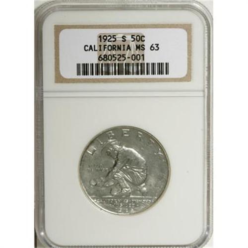 <B>1925-S 50C California MS63 NGC.</B></I> NGC Census: (537/2620). PCGS Population (1090/2317). Mintage: 86,394. Numismedia Wsl. Price for NGC/PCGS coin in MS63: $221. (#9281)<BR><BR><b>Shipping:</b> Coins & Currency (<a target="_blank" href="http://www.heritageauctions.com/common/shipping.php">view shipping information</a>)