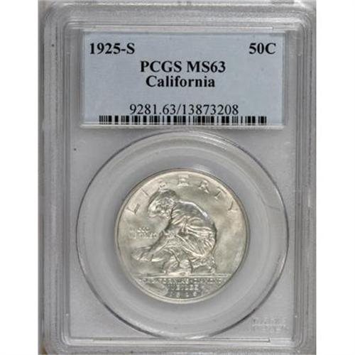 <B>1925-S 50C California MS63 PCGS.</B></I> PCGS Population (1090/2322). NGC Census: (537/2620). Mintage: 86,394. Numismedia Wsl. Price for NGC/PCGS coin in MS63: $221. (#9281)<BR><BR><b>Shipping:</b> Coins & Currency (<a target="_blank" href="http://www.heritageauctions.com/common/shipping.php">view shipping information</a>)
