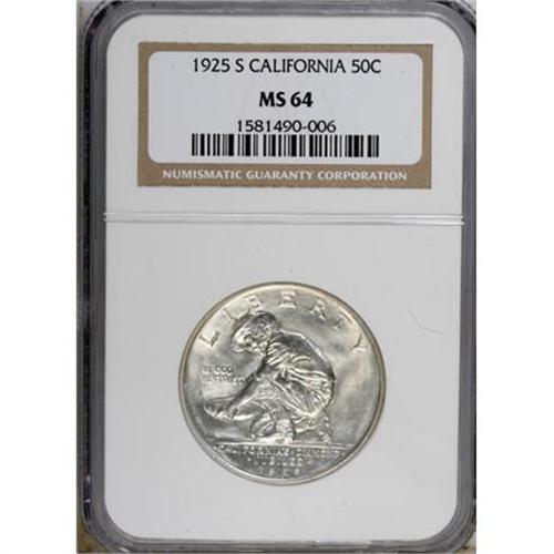 <B>1925-S 50C California MS64 NGC.</B></I> NGC Census: (1292/1305). PCGS Population (1259/1038). Mintage: 86,394. Numismedia Wsl. Price for NGC/PCGS coin in MS64: $424. (#9281)<BR><BR><b>Shipping:</b> Coins & Currency (<a target="_blank" href="http://www.heritageauctions.com/common/shipping.php">view shipping information</a>)