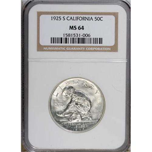 <B>1925-S 50C California MS64 NGC.</B></I> NGC Census: (1292/1305). PCGS Population (1259/1038). Mintage: 86,394. Numismedia Wsl. Price for NGC/PCGS coin in MS64: $424. (#9281)<BR><BR><b>Shipping:</b> Coins & Currency (<a target="_blank" href="http://www.heritageauctions.com/common/shipping.php">view shipping information</a>)
