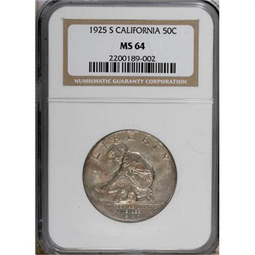 <B>1925-S 50C California MS64 NGC.</B></I> NGC Census: (1297/1308). PCGS Population (1273/1028). Mintage: 86,394. Numismedia Wsl. Price for NGC/PCGS coin in MS64: $424. (#9281)<BR><BR><b>Shipping:</b> Coins & Currency (<a target="_blank" href="http://www.heritageauctions.com/common/shipping.php">view shipping information</a>\)