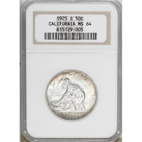 <B>1925-S 50C California MS64 NGC.</B></I> NGC Census: (1308/1328). PCGS Population (1306/1040). Mintage: 86,394. Numismedia Wsl. Price for NGC/PCGS coin in MS64: $430. (#9281)<BR><BR><b>Shipping:</b> Coins & Currency (<a target="_blank" href="http://www.heritageauctions.com/common/shipping.php">view shipping information</a>)