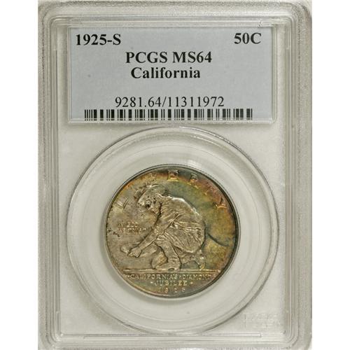 <B>1925-S 50C California MS64 PCGS.</B></I> The strong detail and pleasing luster of this Choice example are characteristic of the California issue. Captivating rainbow toning gives this piece an added dimension of eye appeal.<BR><BR><b>Shipping:</b> Coins & Currency (<a target="_blank" href="http://www.heritageauctions.com/common/shipping.php">view shipping information</a>)