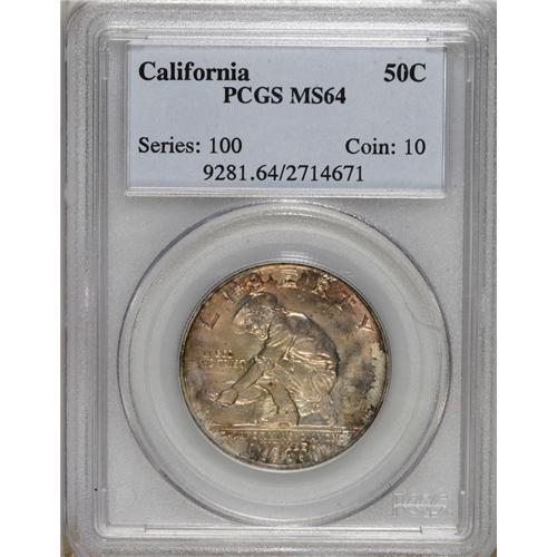 <B>1925-S 50C California MS64 PCGS.</B></I> This highly lustrous example has satin luster visible beneath light gold toning with mottled iridescence. A sharply struck and fully appealing piece struck for the 75th anniversary of California statehood.<BR><BR><b>Shipping:</b> Coins & Currency (<a target="_blank" href="http://www.heritageauctions.com/common/shipping.php">view shipping information</a>)