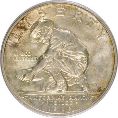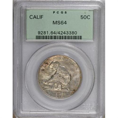 <B>1925-S 50C California MS64 PCGS.</B></I> PCGS Population (1259/1038). NGC Census: (1297/1307). Mintage: 86,394. Numismedia Wsl. Price for NGC/PCGS coin in MS64: $424. (#9281)<BR><BR><b>Shipping:</b> Coins & Currency (<a target="_blank" href="http://www.heritageauctions.com/common/shipping.php">view shipping information</a>)