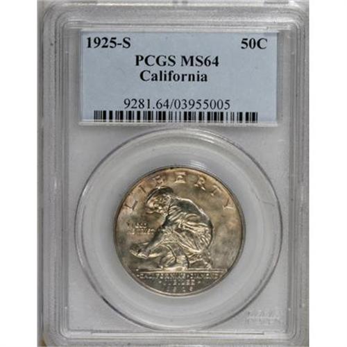 <B>1925-S 50C California MS64 PCGS.</B></I> PCGS Population (1289/1033). NGC Census: (1303/1317). Mintage: 86,394. Numismedia Wsl. Price for NGC/PCGS coin in MS64: $430. (#9281)<BR><BR><b>Shipping:</b> Coins & Currency (<a target="_blank" href="http://www.heritageauctions.com/common/shipping.php">view shipping information</a>)