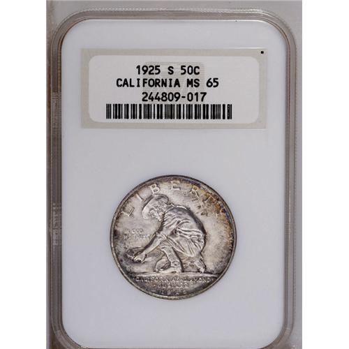 <B>1925-S<50C> California MS65 NGC.</B></I> Mostly brilliant with the usual satiny luster associated with this issue. Both sides have peripheral gold and iridescent toning. A lovely Gem quality example.