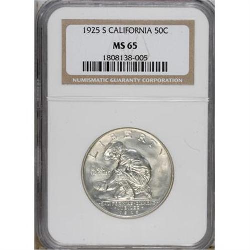 <B>1925-S 50C California MS65 NGC.</B></I> NGC Census: (811/493). PCGS Population (669/369). Mintage: 86,394. Numismedia Wsl. Price for NGC/PCGS coin in MS65: $925. (#9281)<BR><BR><b>Shipping:</b> Coins & Currency (<a target="_blank" href="http://www.heritageauctions.com/common/shipping.php">view shipping information</a>)
