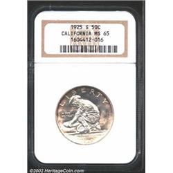 1925-S 50C California MS65 NGC. The brilliant centers give way to violet and gold peripheral patina. Lustrous and well struck with immaculately preserved surfaces. Important notice: We expect to be auctioning lots at the rate of 200-250 per hour. Sometimes eBay Premier live bid software cannot keep up with that pace, so we strongly recommend that you place a realistic proxy bid now as insurance to avoid disappointment. Also please note that all Heritage/CAA lots purchased through eBay Premier carry a 20% Buyer's Premium.