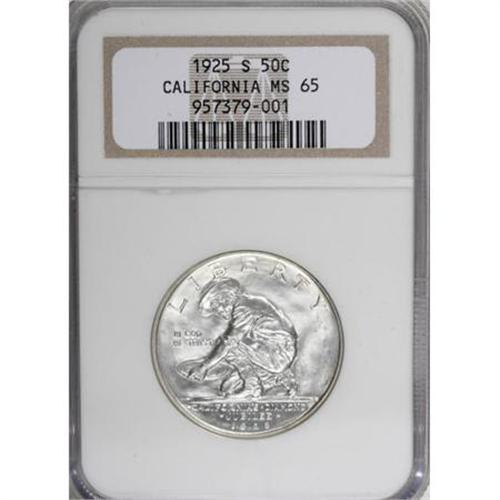 <B>1925-S 50C California MS65 NGC.</B></I> NGC Census: (831/497). PCGS Population (672/368). Mintage: 86,394. Numismedia Wsl. Price for NGC/PCGS coin in MS65: $925. (#9281)<BR><BR><b>Shipping:</b> Coins & Currency (<a target="_blank" href="http://www.heritageauctions.com/common/shipping.php">view shipping information</a>)