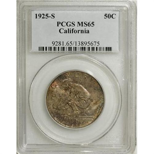 <B>1925-S 50C California MS65 PCGS.</B></I> PCGS Population (669/369). NGC Census: (814/493). Mintage: 86,394. Numismedia Wsl. Price for NGC/PCGS coin in MS65: $925. (#9281)<BR><I>From The Frank DuVall Collection of U.S. Commemoratives.</B></I><BR><BR><b>Shipping:</b> Coins & Currency (<a target="_blank" href="http://www.heritageauctions.com/common/shipping.php">view shipping information</a>)