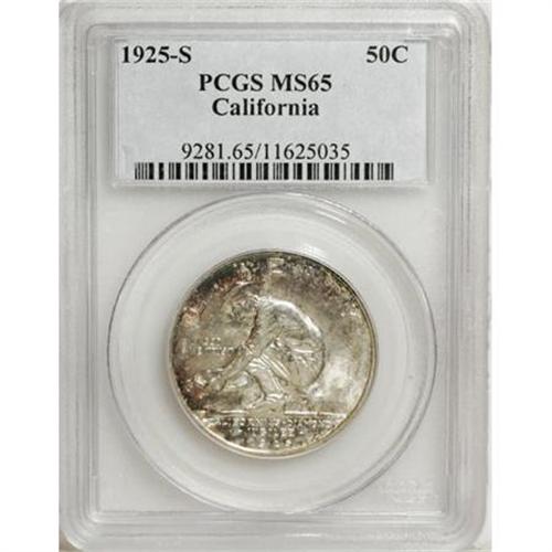 <B>1925-S 50C California MS65 PCGS.</B></I> PCGS Population (660/368). NGC Census: (814/494). Mintage: 86,394. Numismedia Wsl. Price for NGC/PCGS coin in MS65: $925. (#9281)<BR><I>From The Frank DuVall Collection of U.S. Commemoratives.</B></I><BR><BR><b>Shipping:</b> Coins & Currency (<a target="_blank" href="http://www.heritageauctions.com/common/shipping.php">view shipping information</a>)